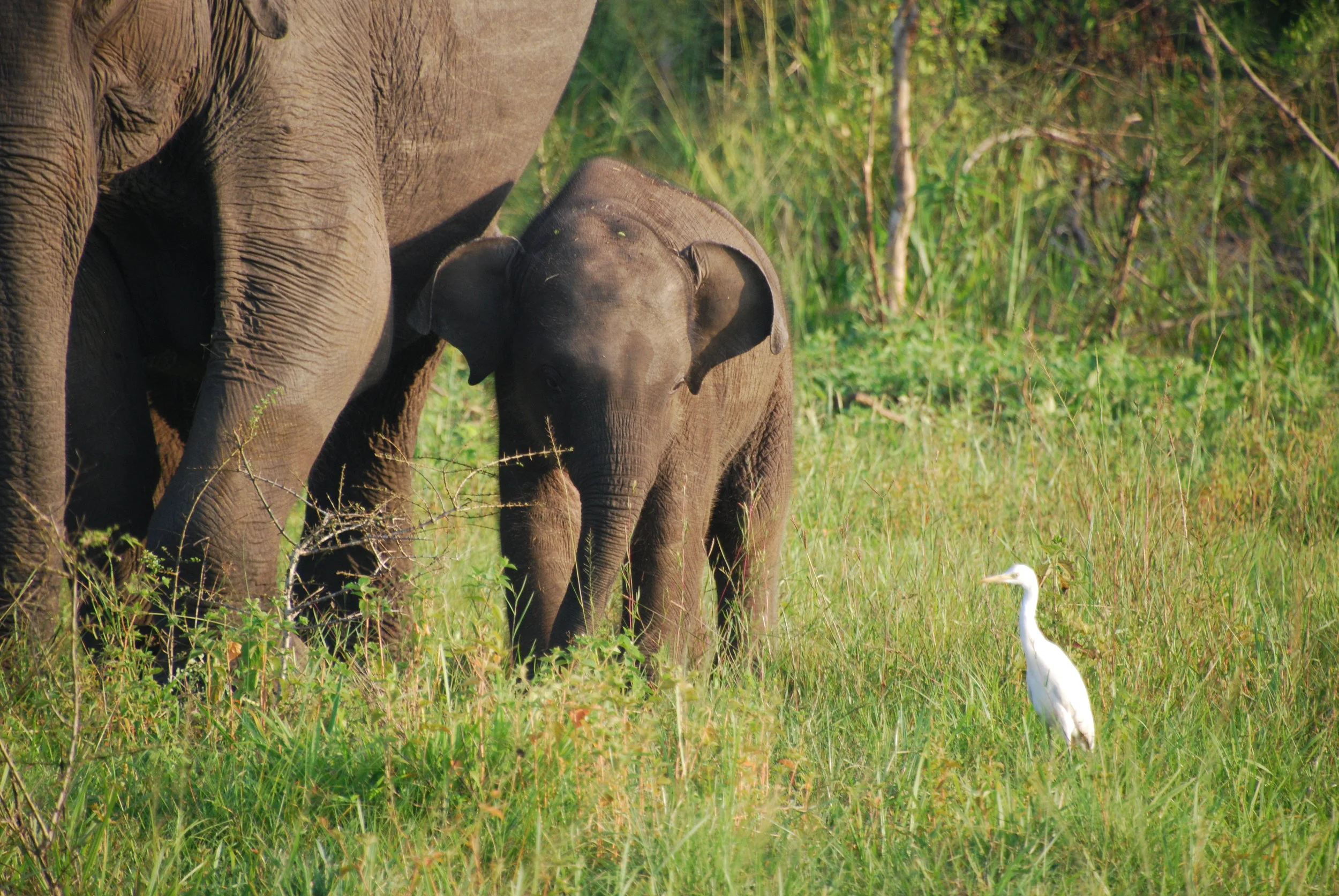 Baby photo #3: Elephant calf sticks close to mom as he nervously eyes a nearby cattle egret, Wasgamuwa National Park, 19 December 2018. Photo: Chase LaDue.